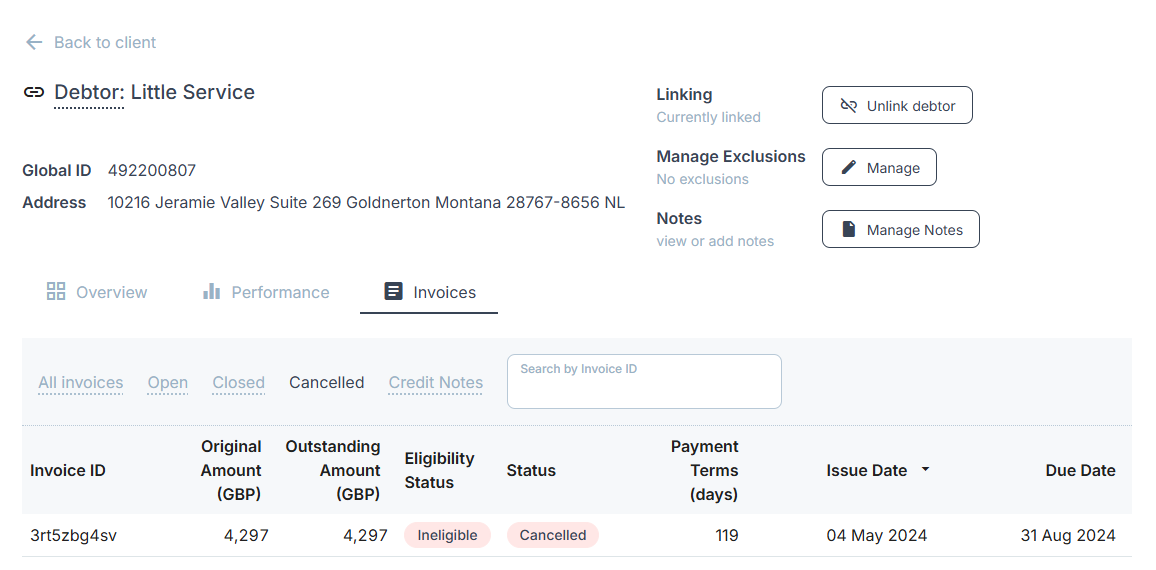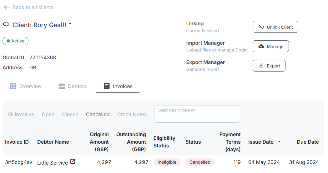 Previously, there was no way to find all of the cancelled invoices for a client or debtor without manually searching each page.