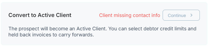 While a client is in the prospect stage, it is possible to save the client with missing contact information. If the client is missing contact information, it will not be possible to promote the client to active. When attempting to do so, an error message will show that this is not possible.